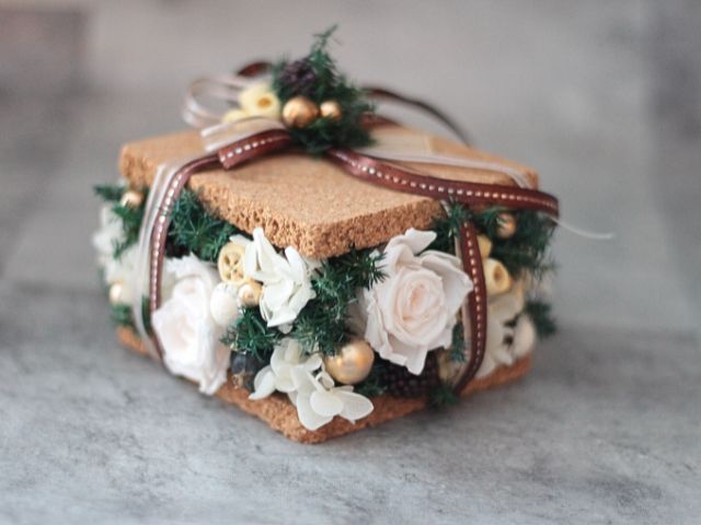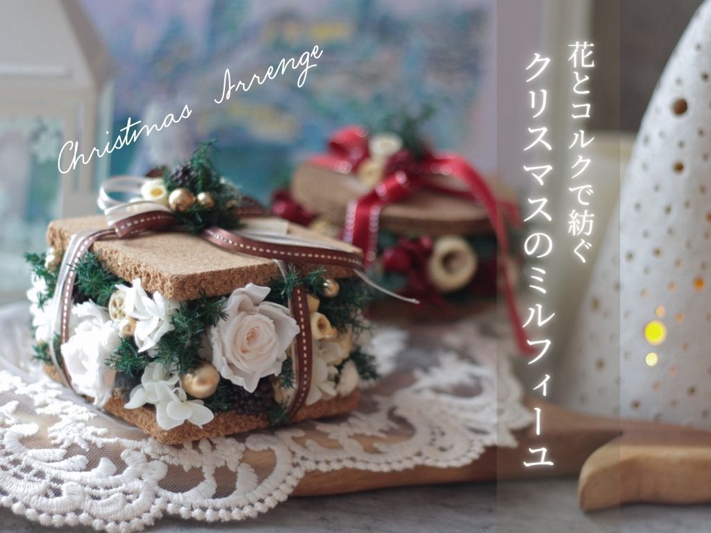 今回ご紹介するのは、コルクと花を重ねて仕立てる「クリスマスのミルフィーユ」。重なり合う花や木の実が、まるでお菓子のミルフィーユのように上品に広がる、大人のためのアレンジです。
