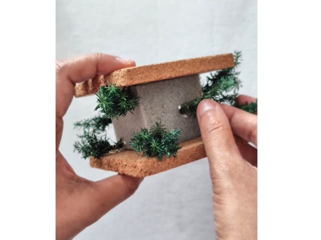ワイヤリングしたヒムロスギを、ワイヤーの長さを3~4cmに切りそろえて使用します。先端にボンドをつけ、セックブリックへランダムに挿し込みます。