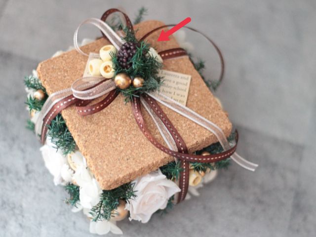 コルクボードを使った小さな「クリスマスのミルフィーユアレンジ」。