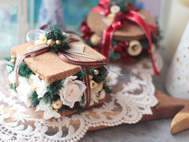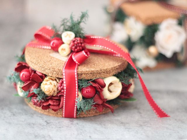 同じ作り方で丸型のコルクコースターを使えば、赤い花材を合わせた可愛らしいバージョンも楽しめます。いくつか並べて飾ると、クリスマスのテーブルをより華やかに彩ってくれますよ✨