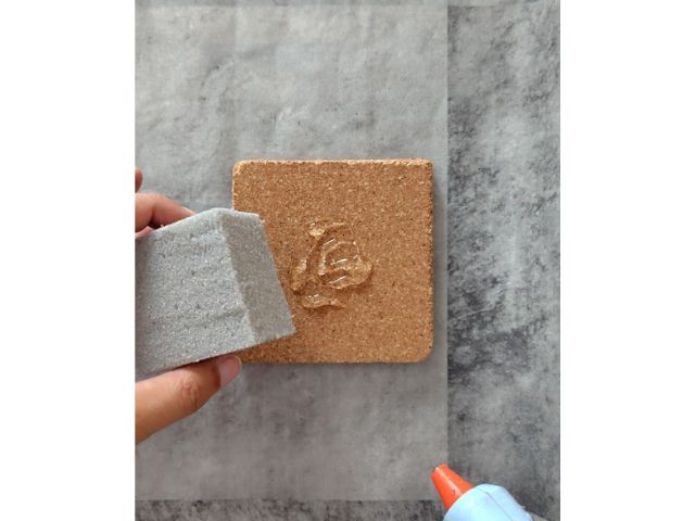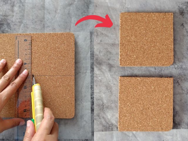 コルクボードを9㎝角のサイズに、カッターでカットします。これを2枚用意します。