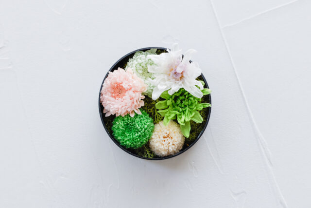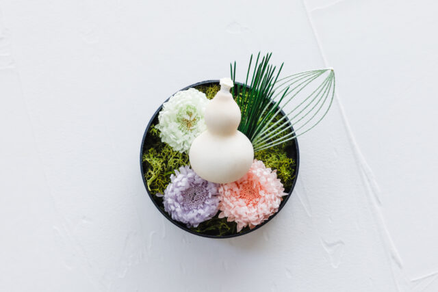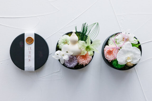 使用する花材は、本当のお花でありながら枯れないプリザーブドフラワーを使用していますので、お水替えなどの手間もなく美しく新年を彩って楽しんでいただけます!