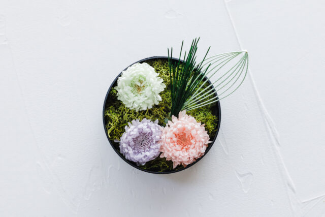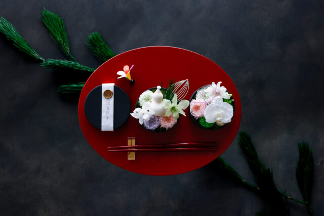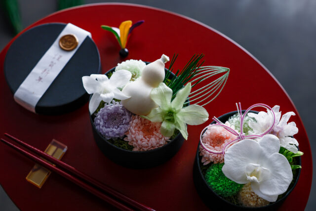 今回は、お料理ではなくてお花をおせちに見立ててフラワーアレンジをします。お正月を迎えるお花としてふさわしいお花を使用しますよ♪